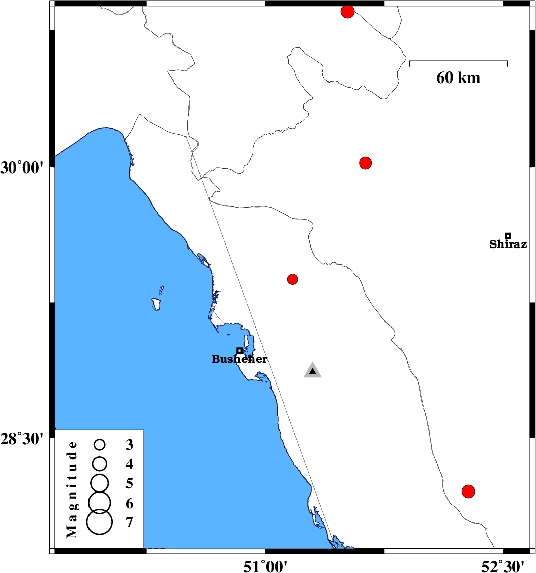 | 2014/11/10 | 22:47:02.1 | 02:17:02.1 | 29.38 | 51.17 | 14 | ML:3 | Bushehr Province, 14 km North of Borazjan | ||