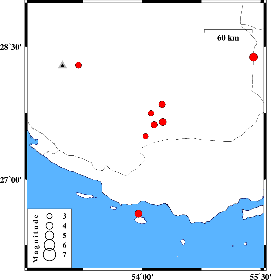 | 2014/11/13 | 00:39:01.8 | 04:09:01.8 | 26.61 | 53.95 | 14 | ML:4.3 | Persian Gulf, 90 km West of Bandar-e lengeh | ||