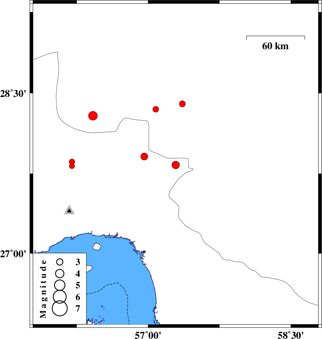 | 2014/11/18 | 01:07:49.4 | 04:37:49.4 | 28.4 | 57.36 | 15 | ML:3 | Kerman Province, 48 km South-West of Jiroft | ||
