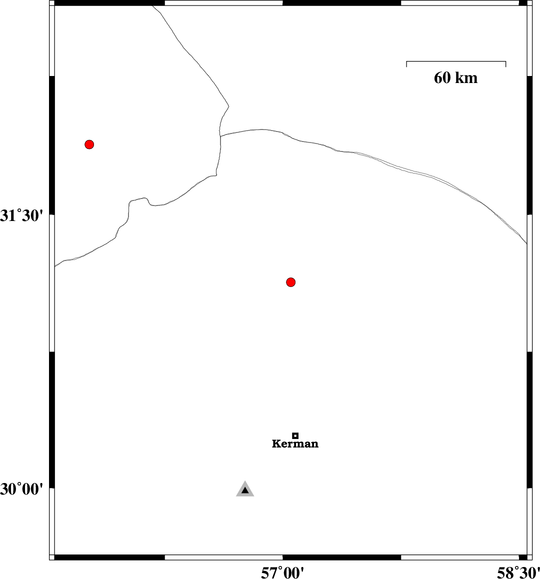 2014/11/24 | 09:49:30.5 | 13:19:30.5 | 31.13 | 57.05 | 15 | ML:2.5 | Kerman Province, 27 km South-East of Ravar | ||