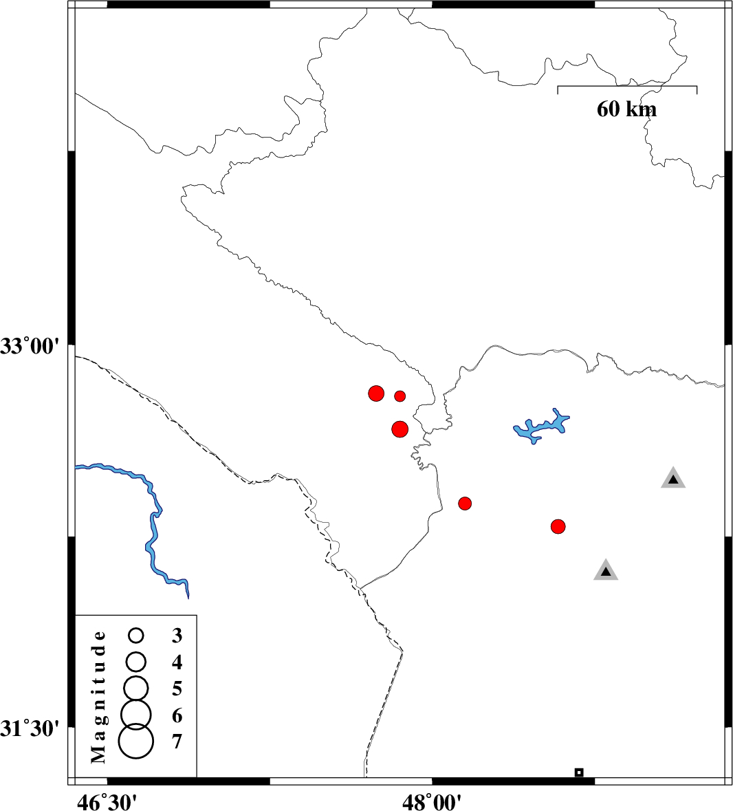 | 2014/11/26 | 01:41:26.0 | 05:11:26.0 | 32.8 | 47.85 | 14 | ML:2.2 | Ilam Province, 41 km South-East of Pol-e dokhtar | ||