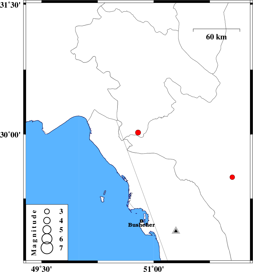 | 2014/12/03 | 09:41:26.2 | 13:11:26.2 | 29.5 | 52.05 | 15 | ML:2.9 | Fars Province, 40 km South-East of Kazerun |