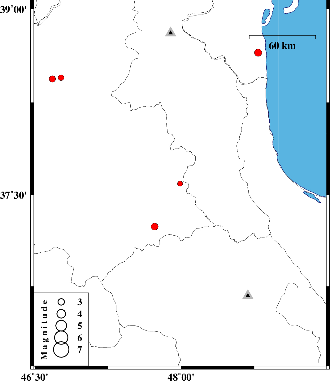 2014/11/23 | 02:49:48.2 | 06:19:48.2 | 38.44 | 46.68 | 15 | ML:3 | Azarbaijan Sharghi Province, 36 km West of Ahar |