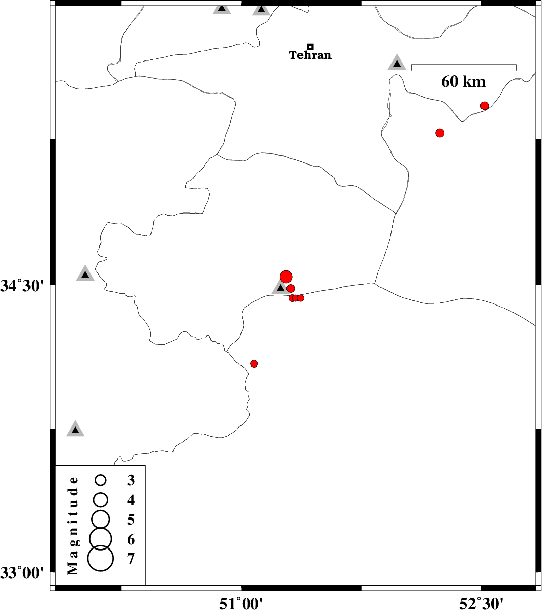 | 2014/12/23 | 00:35:30.2 | 04:05:30.2 | 34.43 | 51.34 | 9 | ML:1.9 | Esfahan Province, 43 km North-West of Aran va bidgol | ||