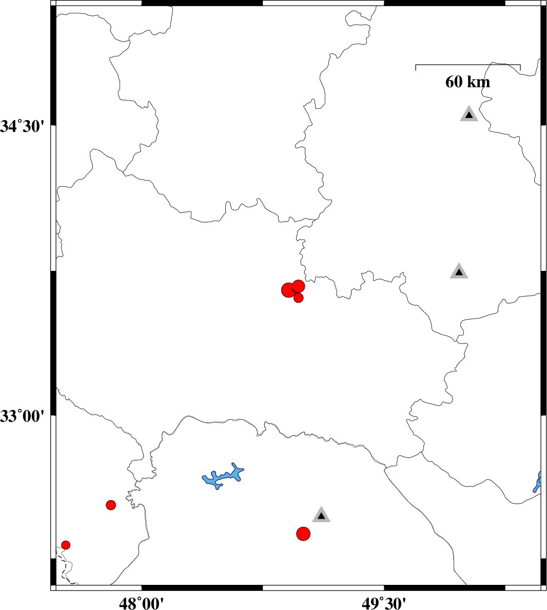 | 2015/01/06 | 19:00:29.4 | 22:30:29.4 | 33.61 | 48.97 | 15 | ML:2.7 | Lorestan Province, 17 km North of Dorud | ||
