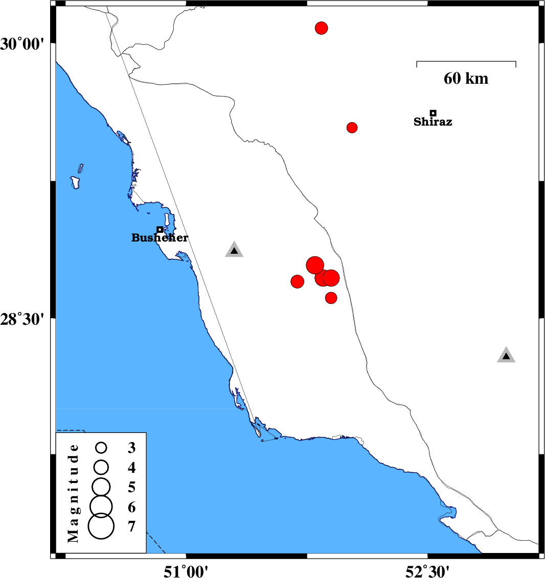 | 2015/01/05 | 13:42:36.9 | 17:12:36.9 | 28.72 | 51.85 | 14 | ML:4.7 | Bushehr Province, 28 km South-West of Farashband |