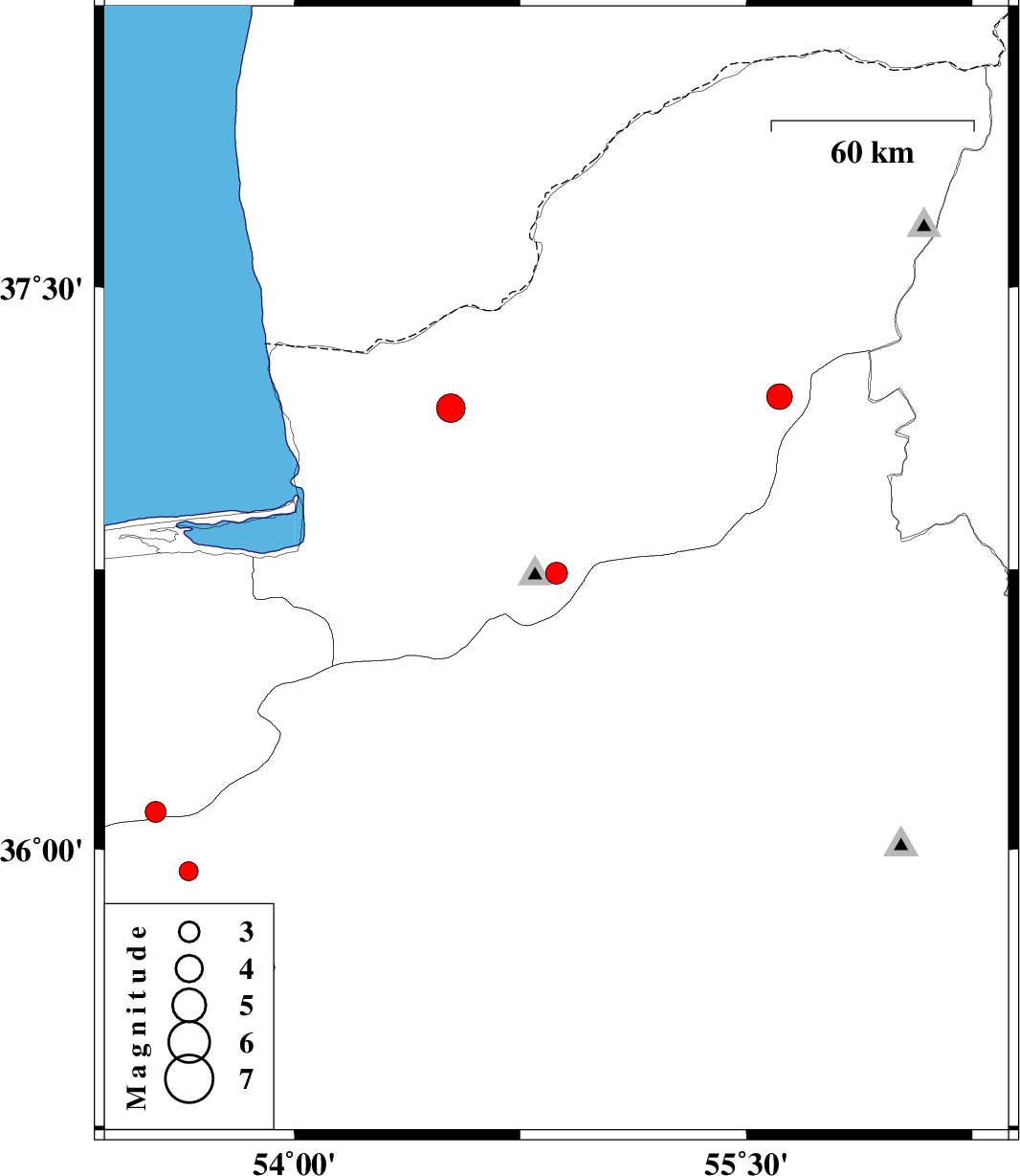 2015/01/05 | 12:43:33.8 | 16:13:33.8 | 37.18 | 54.52 | 15 | ML:4.2 | Golestan Province, 19 km North of Aq Qaleh | ||