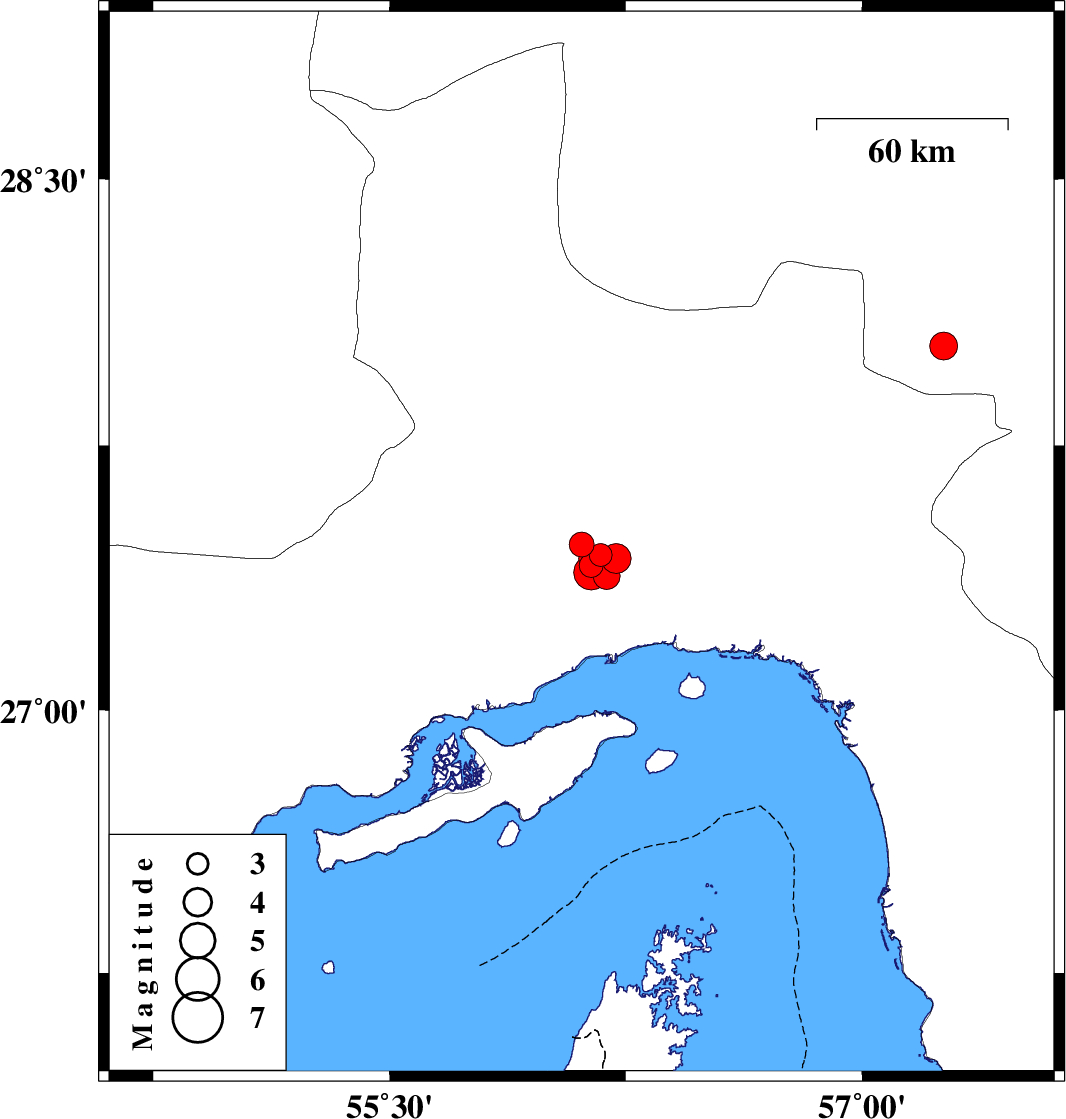 | 2015/01/28 | 00:50:47.7 | 04:20:47.7 | 27.44 | 56.17 | 17 | ML:3.2 | Hormozgan Province, 30 km North-West of Bandar-e abbas | ||