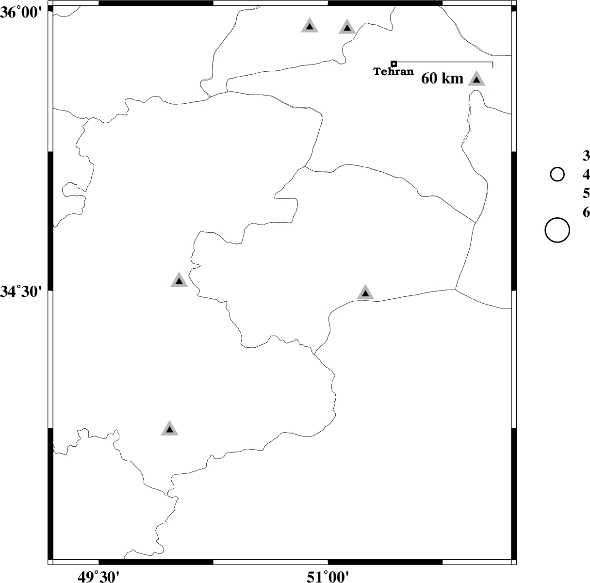 | 2015/01/30 | 13:35:21.7 | 17:05:21.7 | 35.45 | 51.39 | 18 | ML:1.5 | Tehran Province, 18 km South of Rey |