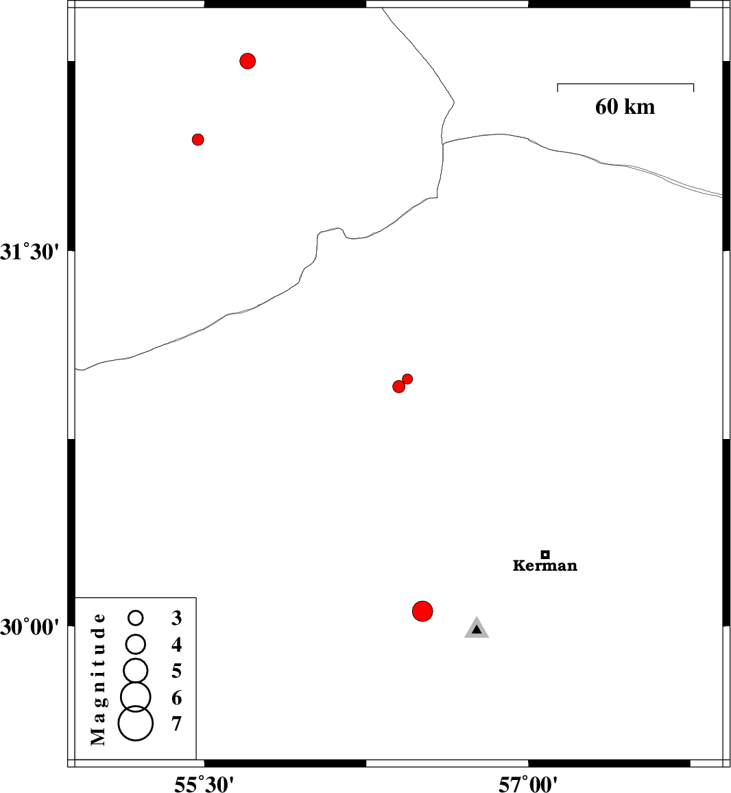 2015/03/08 | 18:43:33.1 | 22:13:33.1 | 30.06 | 56.51 | 14 | ML:4.3 | Kerman Province, 16 km North of Bardsir | ||