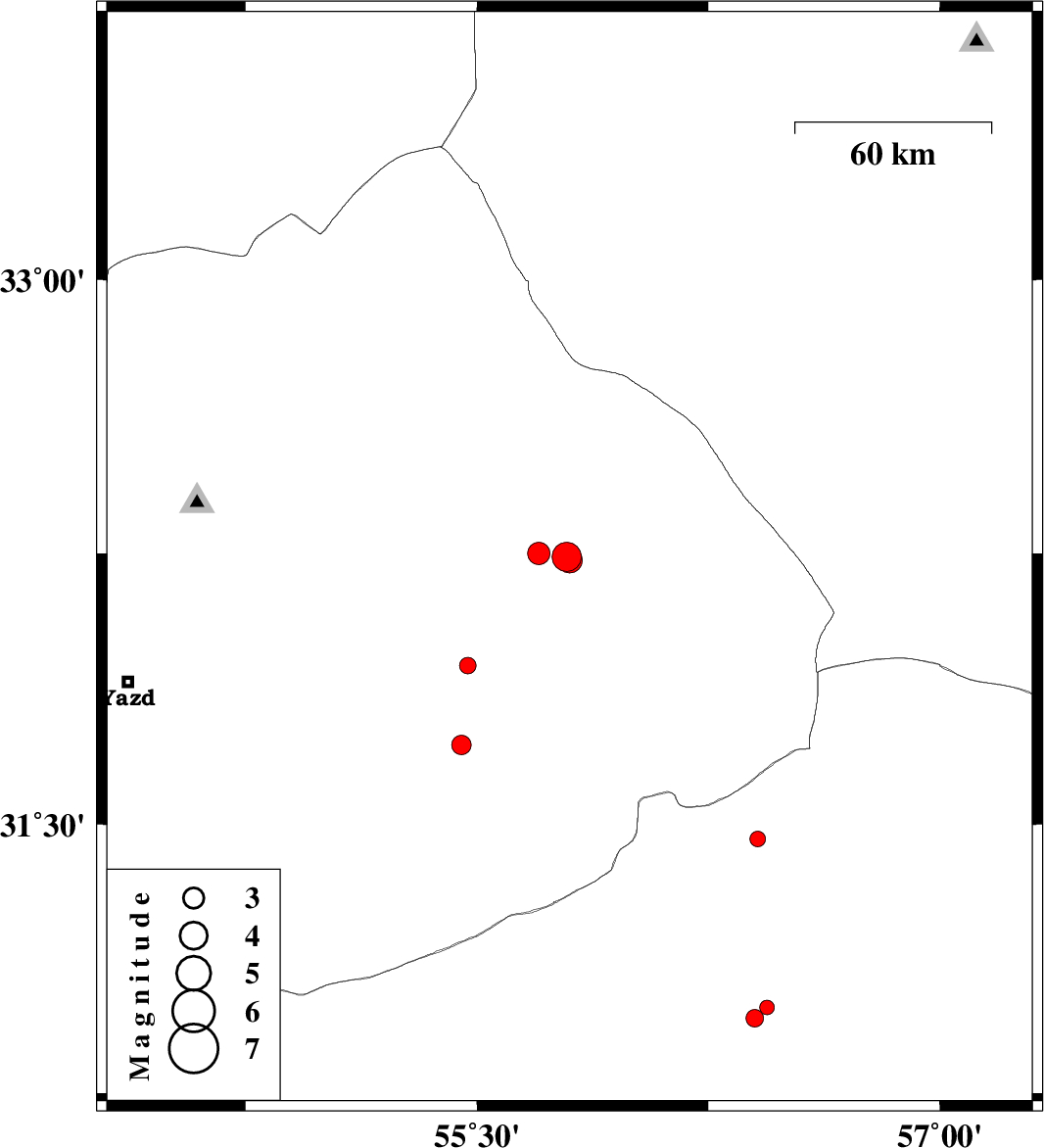 | 2015/03/05 | 10:28:14.6 | 13:58:14.6 | 32.25 | 55.7 | 14 | ML:3.2 | Yazd Province, 78 km North-East of Bafq | ||