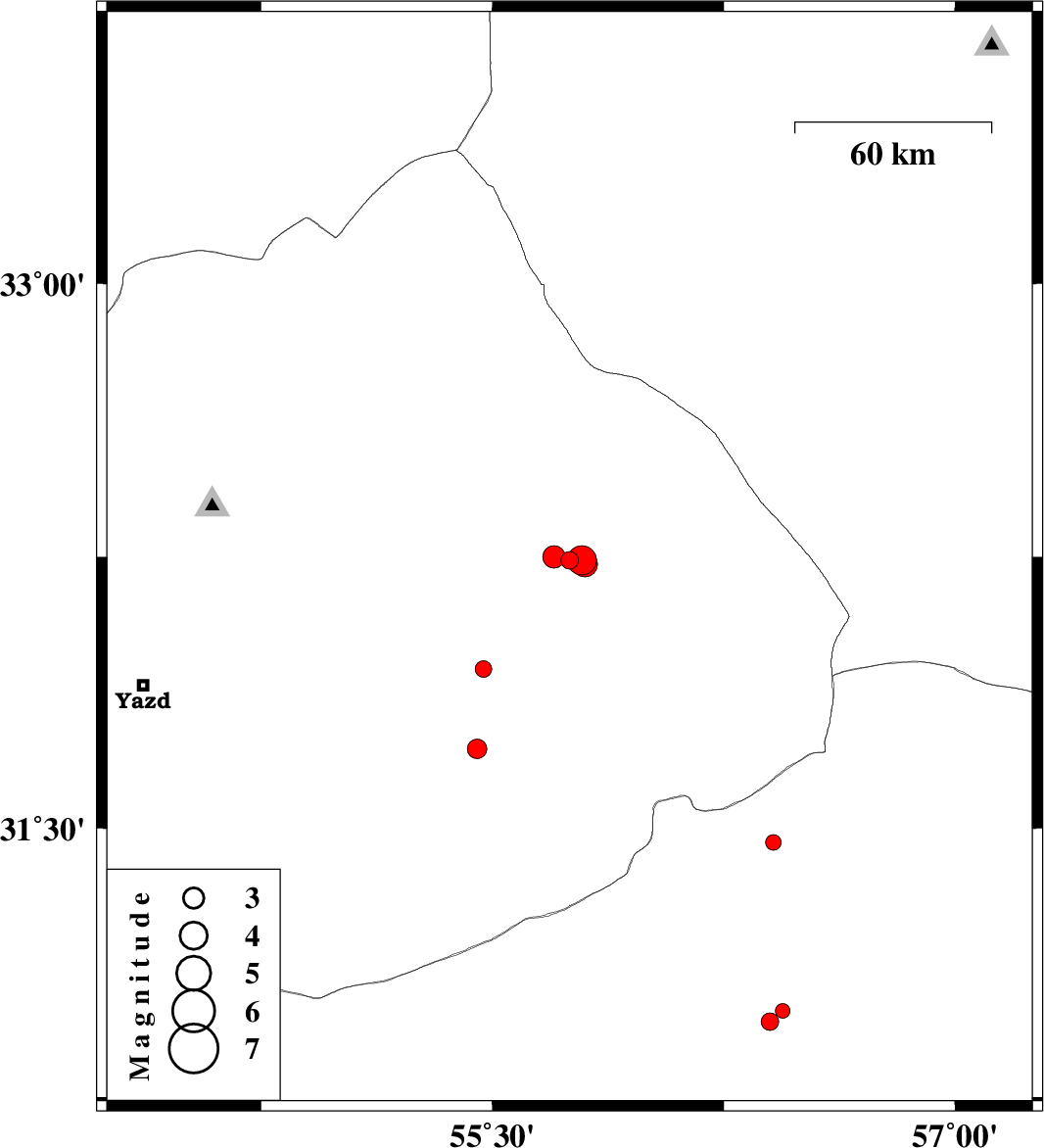 | 2015/03/05 | 10:28:14.6 | 13:58:14.6 | 32.25 | 55.7 | 14 | ML:3.2 | Yazd Province, 78 km North-East of Bafq | ||