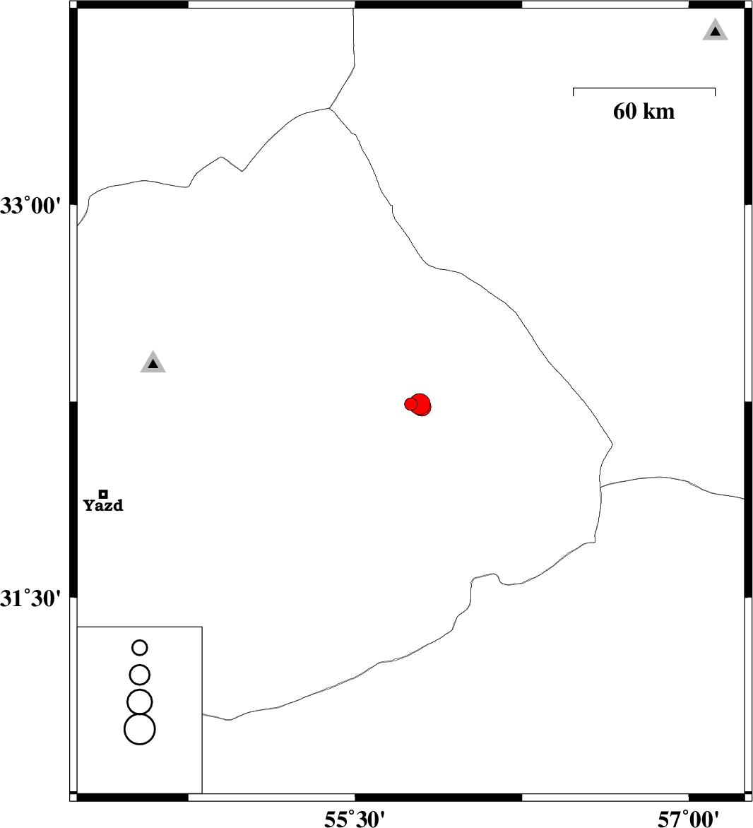 | 2015/03/30 | 06:45:25.1 | 11:15:25.1 | 32.23 | 55.8 | 14 | ML:3.6 | Yazd Province, 80 km North-East of Bafq |