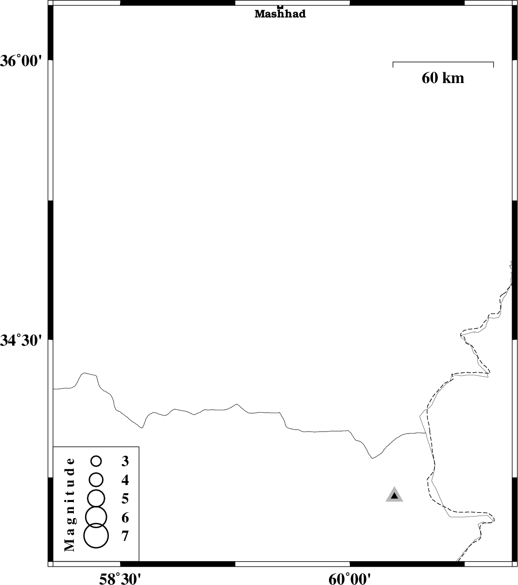 | 2015/04/02 | 21:09:54.3 | 01:39:54.3 | 34.79 | 59.56 | 15 | ML:2.9 | Khorasan(center) Province, 58 km North-West of Khaf |
