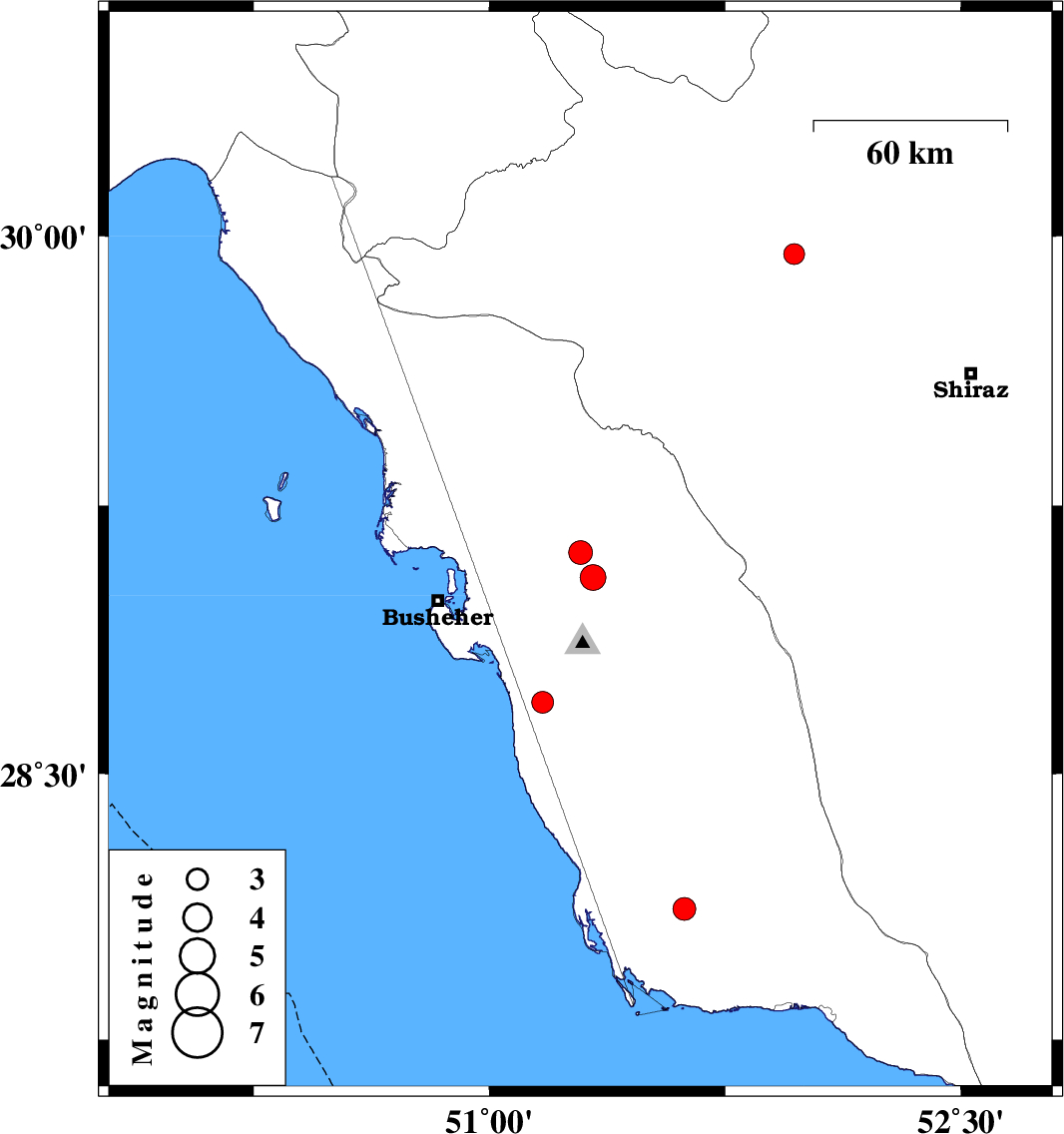 | 2015/04/05 | 05:03:57.7 | 09:33:57.7 | 29.12 | 51.29 | 7 | ML:3.4 | Bushehr Province, 18 km South of Borazjan | ||