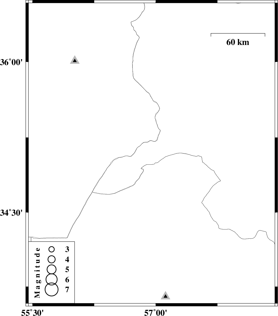 | 2015/04/09 | 02:22:34.8 | 06:52:34.8 | 35.08 | 56.95 | 14 | ML:3.2 | Khorasan(center) Province, 93 km South-West of Bardeskan |