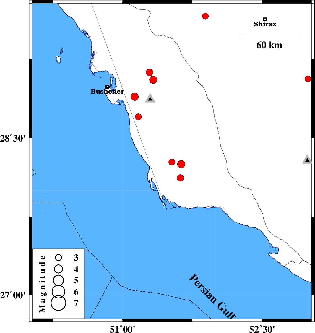 | 2015/04/05 | 05:03:57.7 | 09:33:57.7 | 29.12 | 51.29 | 7 | ML:3.4 | Bushehr Province, 18 km South of Borazjan | ||