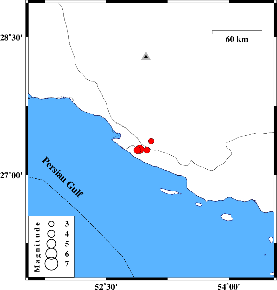 | 2015/04/19 | 03:17:06.9 | 07:47:06.9 | 27.37 | 53.05 | 15 | ML:3.1 | Fars Province, 12 km West of Lamerd | ||