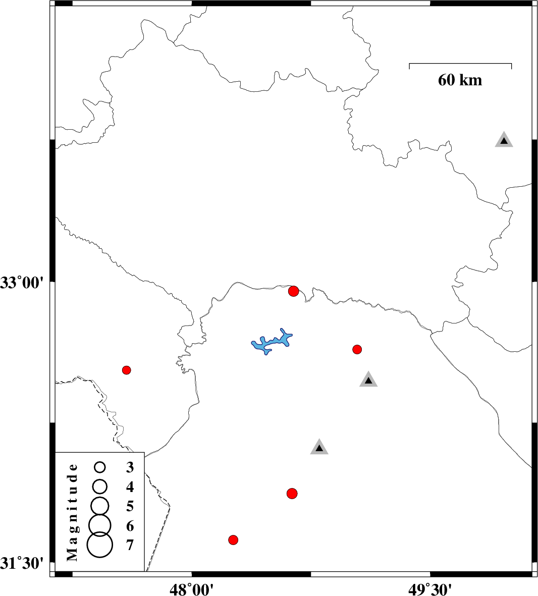 | 2015/04/18 | 23:23:23.2 | 03:53:23.2 | 31.87 | 48.63 | 14 | ML:3 | Khoozestan Province, 29 km South-West of Shushtar | ||