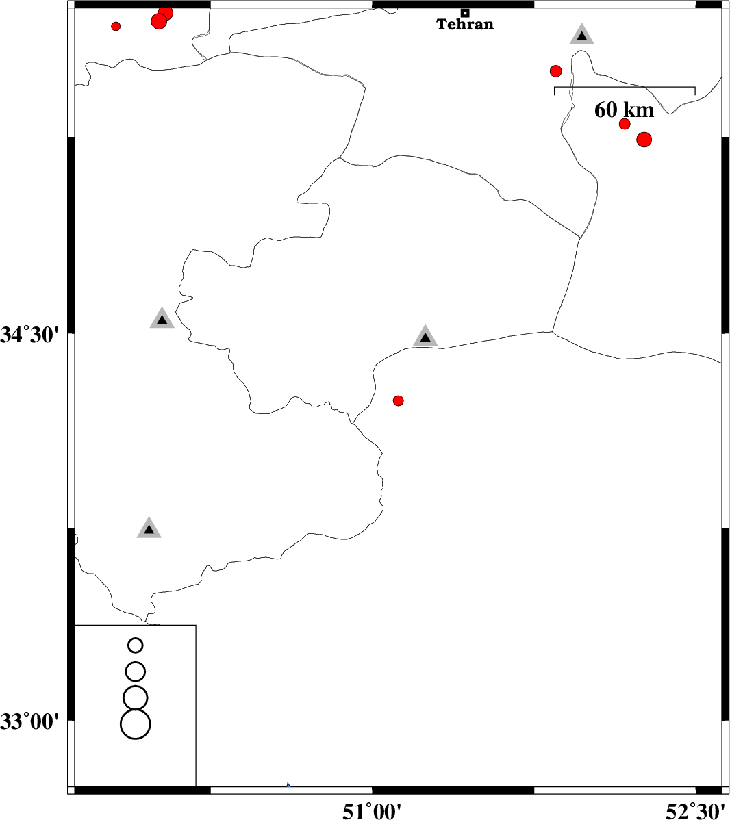 | 2015/04/01 | 03:18:50.3 | 07:48:50.3 | 35.3 | 52.17 | 14 | ML:2.3 | Semnan Province, 18 km West of Garmsar |