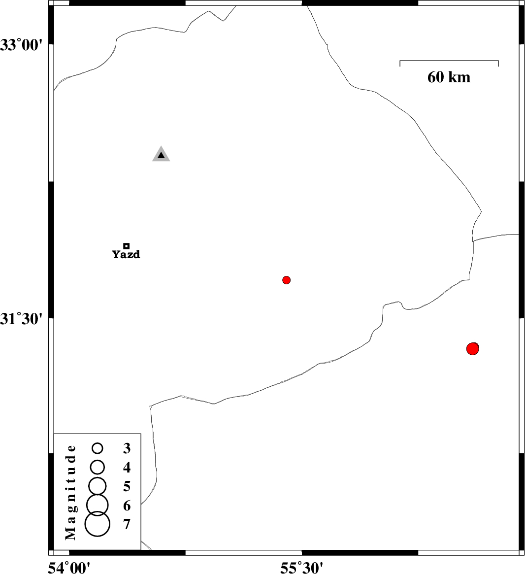 | 2015/04/30 | 09:51:21.4 | 14:21:21.4 | 31.71 | 55.4 | 18 | ML:2.3 | Yazd Province, 12 km North of Bafq | ||