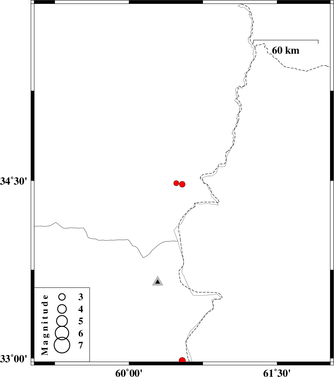 | 2015/05/03 | 08:31:06.3 | 13:01:06.3 | 34.47 | 60.54 | 15 | ML:2.7 | Khorasan(center) Province, 38 km East of Khaf | ||