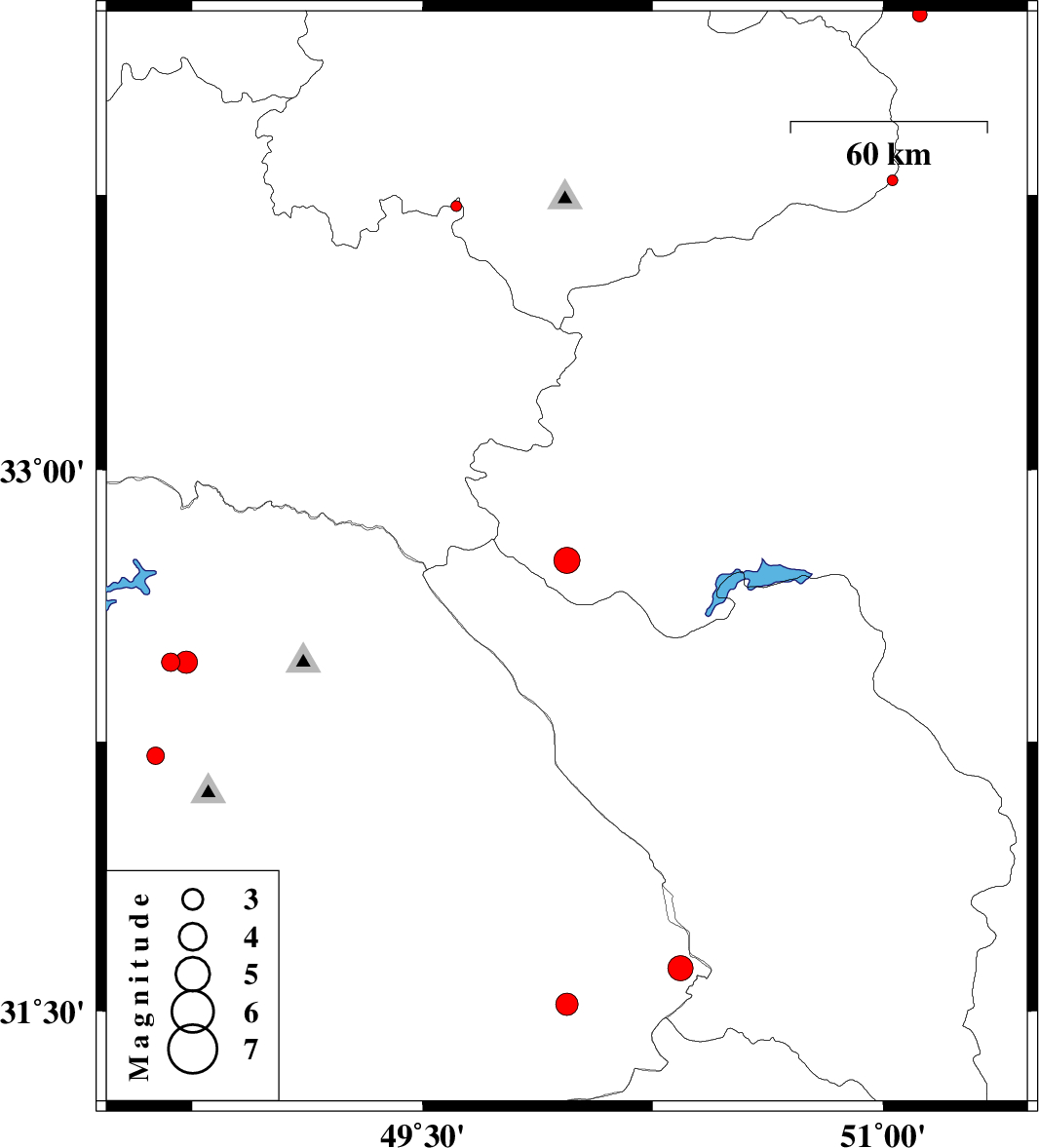 | 2015/05/02 | 09:52:11.9 | 14:22:11.9 | 31.62 | 50.34 | 15 | ML:3.6 | Khoozestan Province, 44 km East of Bagh Malek | ||