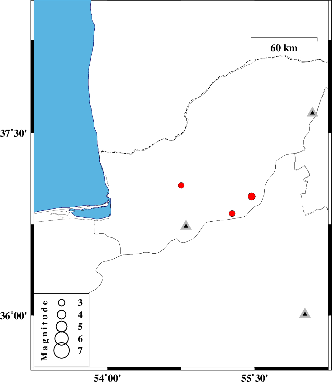 | 2015/05/05 | 02:00:58.8 | 06:30:58.8 | 36.84 | 55.27 | 15 | ML:2.8 | Golestan Province, 22 km South-East of Ramian |