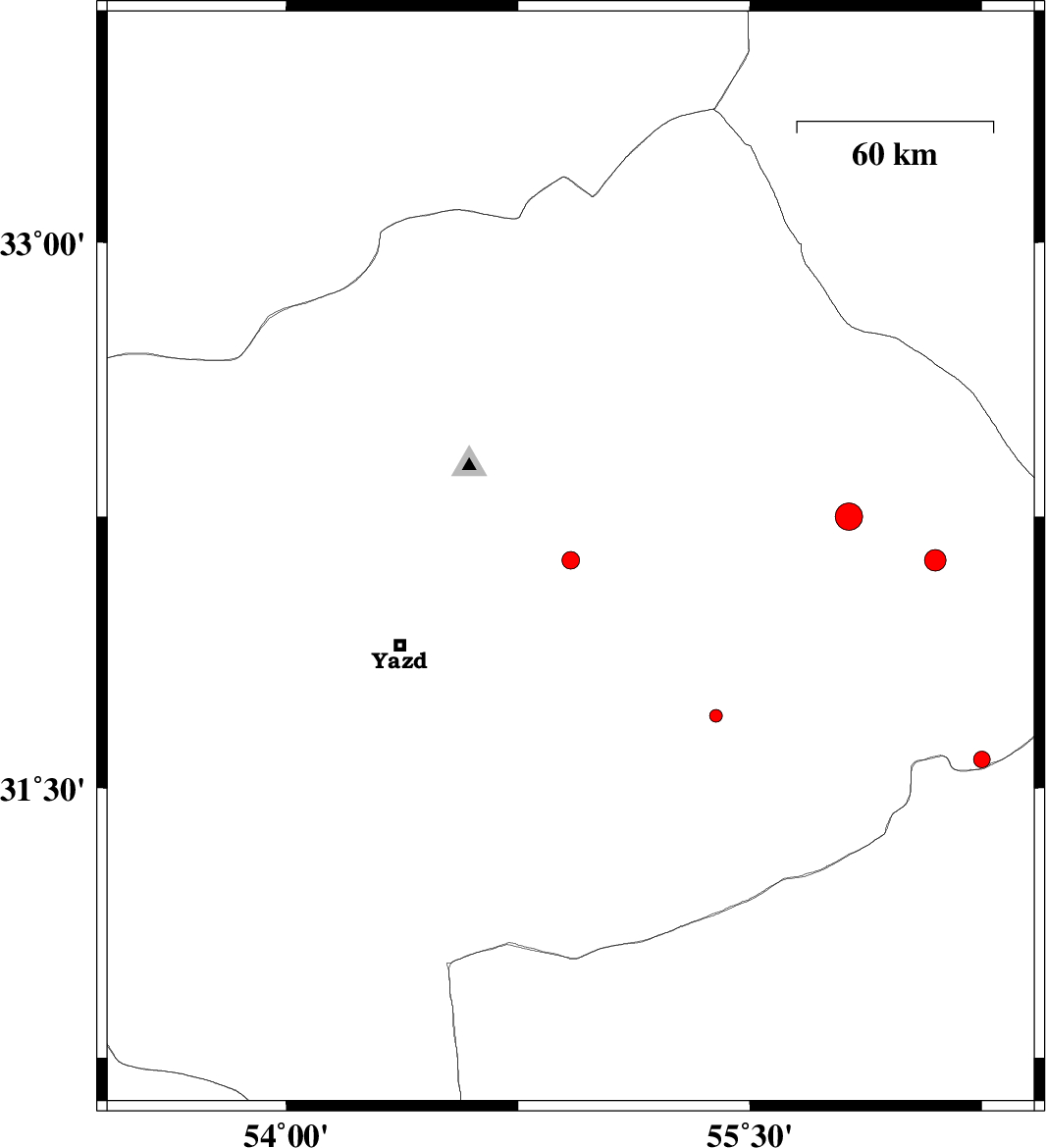 | 2015/05/05 | 09:49:59.7 | 14:19:59.7 | 31.7 | 55.39 | 16 | ML:1.8 | Yazd Province, 10 km Bafq |