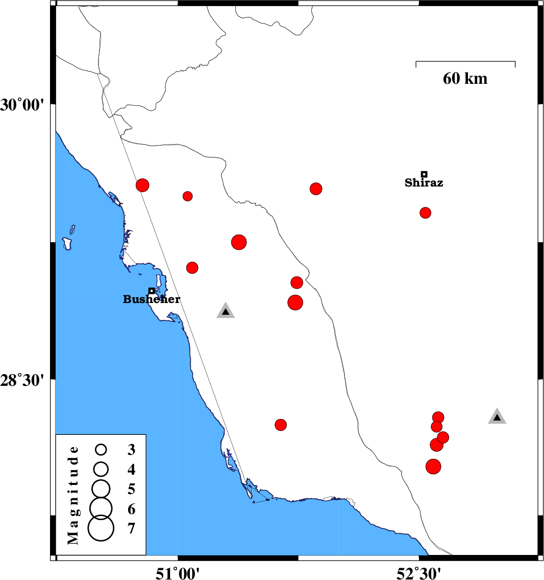 2015/04/20 | 02:26:39.1 | 06:56:39.1 | 29.5 | 51.06 | 6 | ML:2.7 | Bushehr Province, 30 km North-West of Borazjan | ||