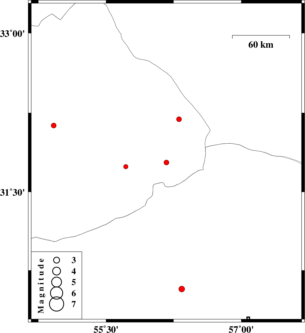 | 2015/05/11 | 05:04:49.3 | 09:34:49.3 | 32.13 | 54.92 | 14 | ML:2.5 | Yazd Province, 58 km North-East of Yazd |