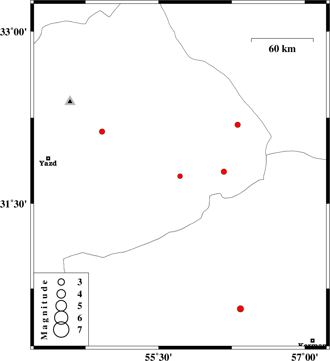 | 2015/05/11 | 05:04:49.3 | 09:34:49.3 | 32.13 | 54.92 | 14 | ML:2.5 | Yazd Province, 58 km North-East of Yazd |