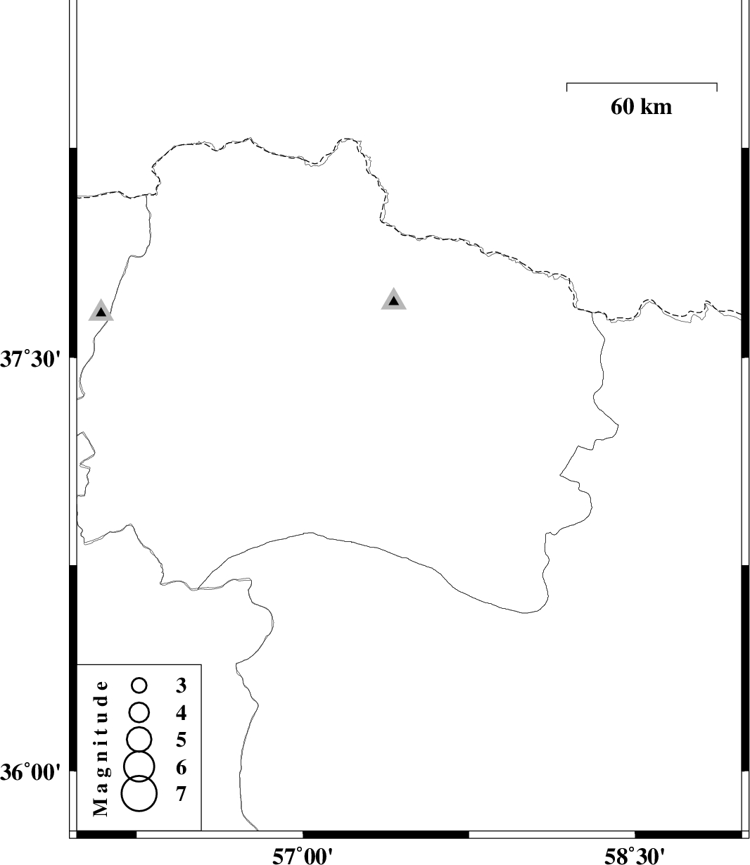 | 2015/05/17 | 22:44:49.4 | 03:14:49.4 | 37.28 | 57.48 | 14 | ML:2.1 | Khorasan(north) Province, 24 km North of Esfarayen |