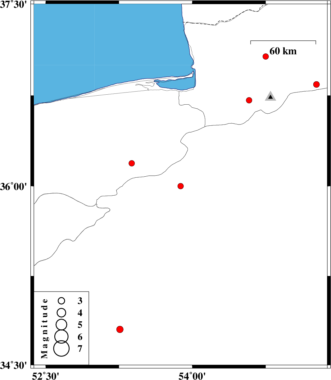 | 2015/05/15 | 14:39:16.8 | 19:09:16.8 | 34.67 | 52.85 | 37 | ML:2.6 | Semnan Province, 76 km South-East of Garmsar | ||