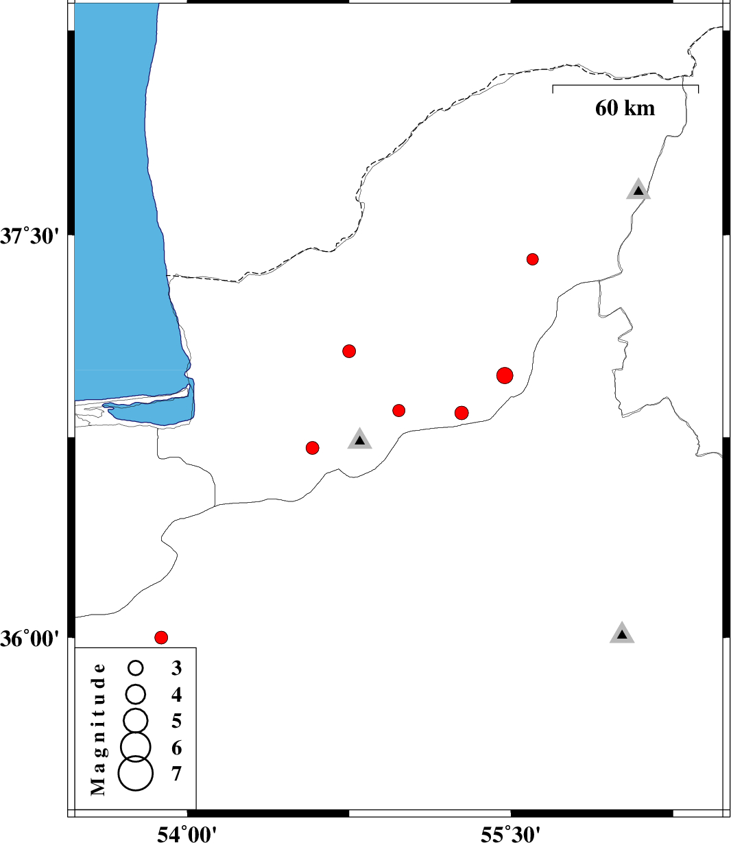 | 2015/05/05 | 02:00:58.8 | 06:30:58.8 | 36.84 | 55.27 | 15 | ML:2.8 | Golestan Province, 22 km South-East of Ramian |