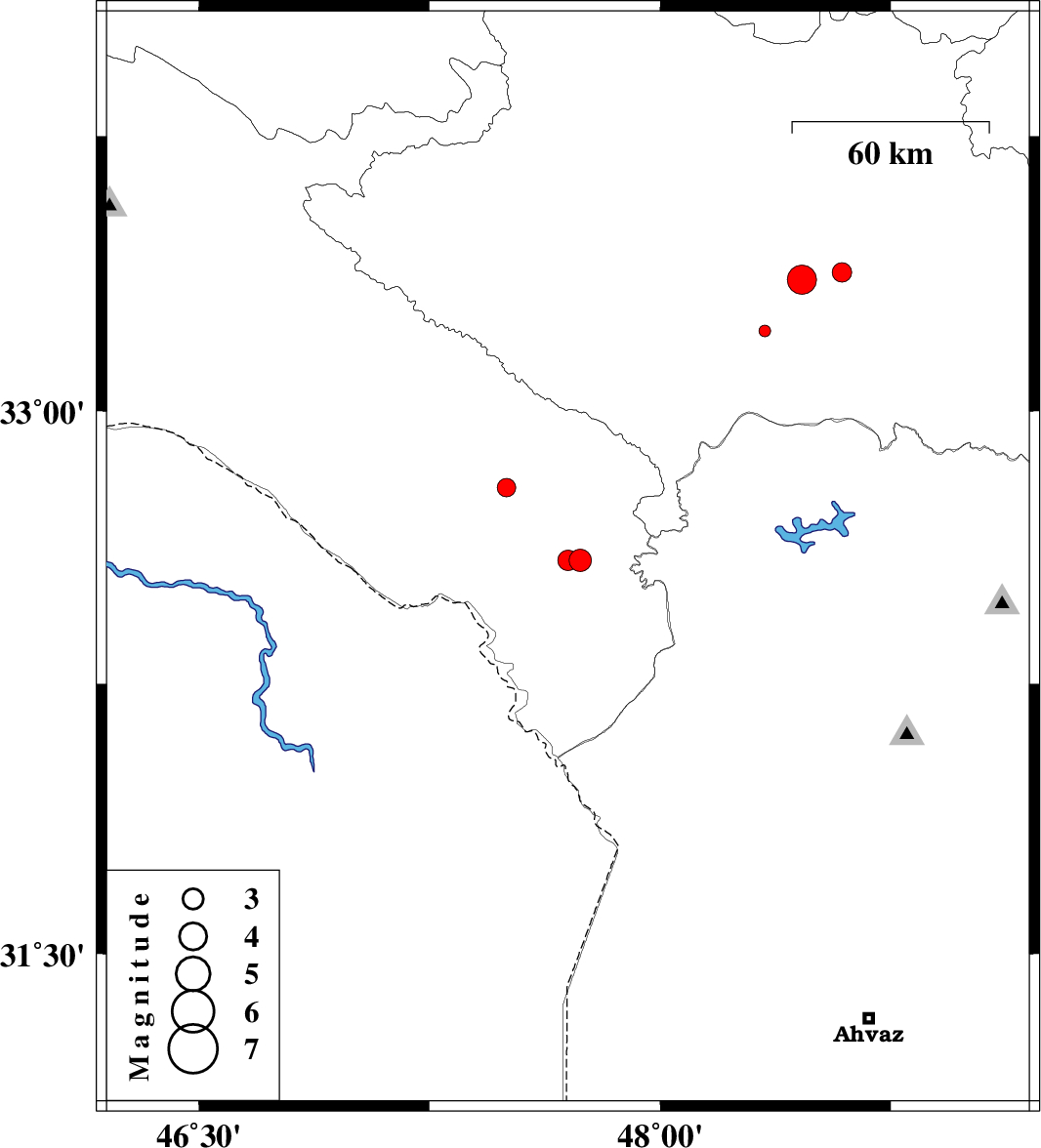 | 2015/05/23 | 01:06:06.9 | 05:36:06.9 | 32.59 | 47.74 | 41 | ML:3.3 | Ilam Province, 47 km South-East of Dehloran | ||