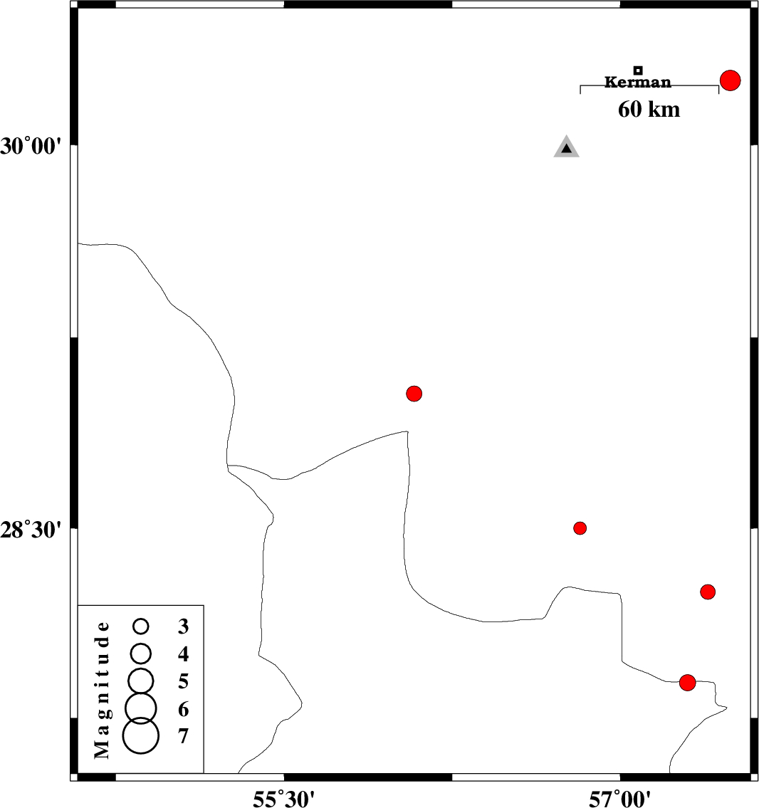 | 2015/05/20 | 18:44:27.8 | 23:14:27.8 | 28.25 | 57.39 | 18 | ML:2.9 | Kerman Province, 45 km North-West of Kahnuj |