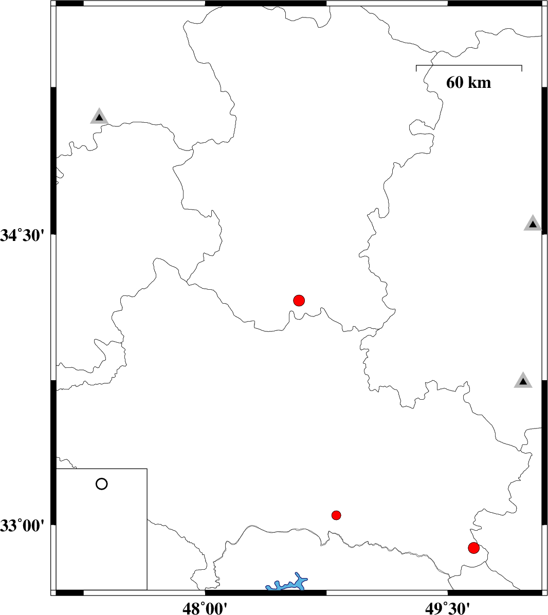 | 2015/06/03 | 17:49:20.4 | 22:19:20.4 | 34.16 | 48.58 | 16 | ML:3.1 | Hamedan Province, 20 km East of Nahavand | ||