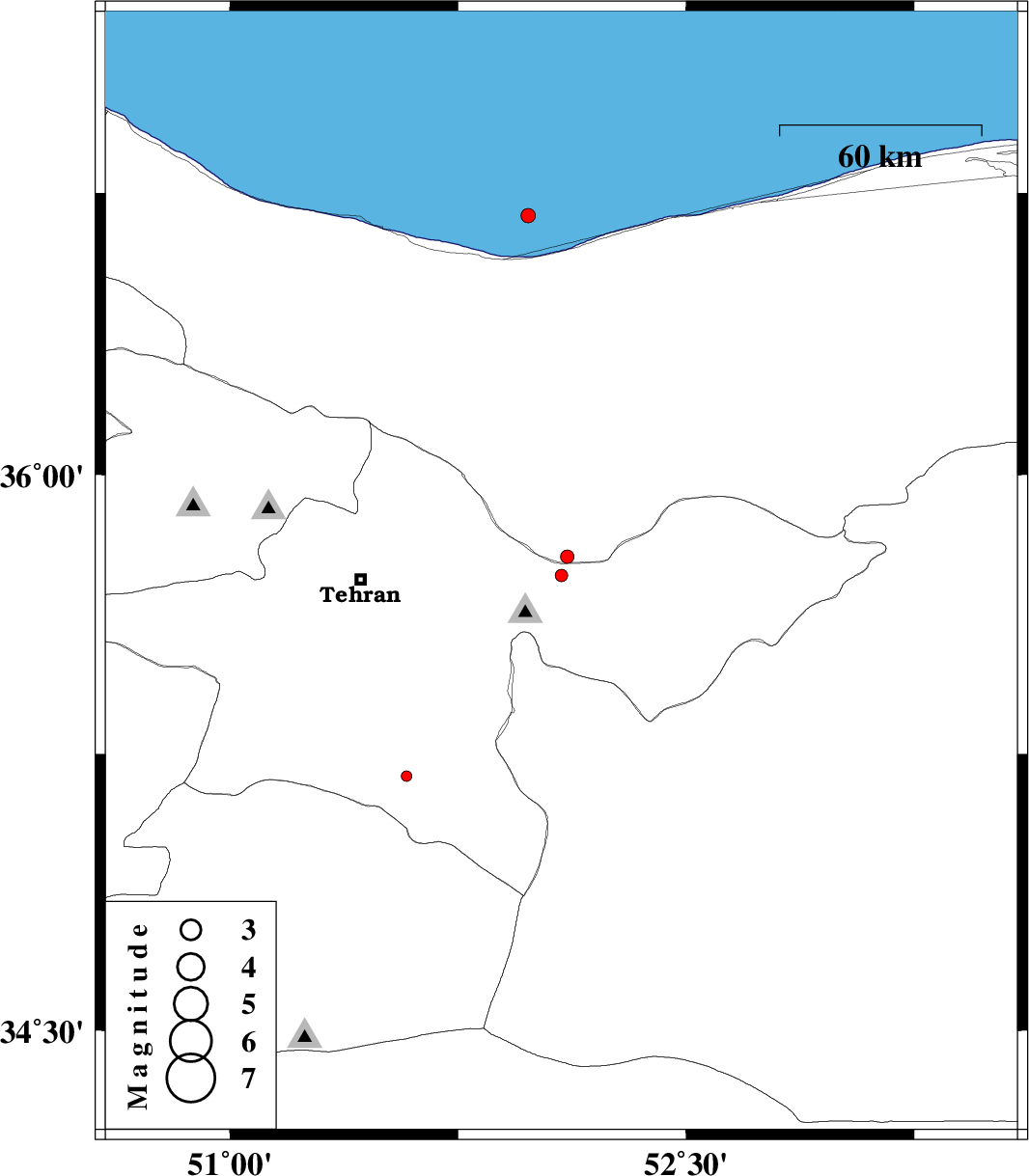 | 2015/06/03 | 13:21:05.1 | 17:51:05.1 | 36.69 | 51.98 | 14 | ML:2.1 | Caspian Sea, 14 km North of Nur | ||