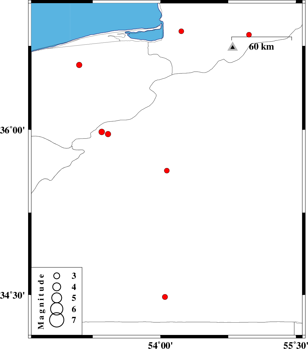 | 2015/05/21 | 02:17:41.6 | 06:47:41.6 | 36.85 | 54.98 | 15 | ML:2.5 | Golestan Province, 12 km East of Ali Abad |