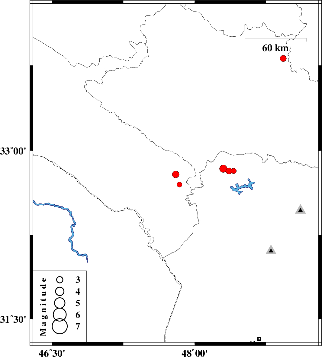 | 2015/06/27 | 22:20:09.4 | 02:50:09.4 | 33.81 | 48.93 | 6 | ML:2.9 | Lorestan Province, 18 km East of Borujerd | ||